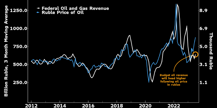 Повышение ключевой ставки сразу на 1% в июле не смогло остановить ослабления рубля, тогда как решение оказаться от покупки юаней в ФНБ в рамках бюджетного правила может оказаться в этом смысле более эффективным. Однако для стабилизации российской валюты ЦБР будет вынужден повысить ключевую ставку до 10%, а расходы федерального бюджета должны будут остаться в рамках текущих ограничений, пишет аналитик Bloomberg Economics Александр Исаков. Нефтегазовые доходы федерального бюджета РФ (белым, левая шкала, среднее значение за три месяца, в млрд рублей) и цена российской нефти в рублях за баррель (правая шкала, тыс. рублей). Ожидается, что рост рублевой цены нефти спровоцирует рост доходов бюджета РФ. Источник: Bloomberg Фокус денежно-кредитной политики (ДКП), которую проводит Банк России, смещается с занятости и экономики на инфляцию и курс рубля. Повышение ключевой ставки сразу на 1% в июле не смогло остановить ослабления российской валюты, тогда как решение оказаться от покупки юаней в ФН
