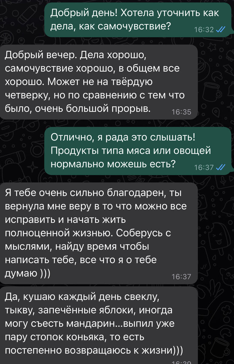 В ноябре 2022 года ко мне обращался клиент с жалобами на симптомы СРК. Мы успешно поработали, и он вернулся ко мне в апреле 2023 с другой проблемой, не связанной с кишечником. Поскольку прошло достаточно времени, чтобы оценить эффект, ниже вкратце опишу, с чем он пришел, и какие результаты сохраняются до сих пор. Что было до нашей работы: не мог есть то, что едят нормальные люди: ни овощи, ни фрукты, ни сладкое, ни соленое, ни молочное («приходишь в ресторан, читаешь меню – и напрягает, что надо просить, чтобы приготовили отдельно для тебя») испытывал тяжесть внизу живота, распирающую боль в подреберье, боли будто перемещались по животу, «то здесь болит, то там» (при этом врачи не находили причину боли, было несколько колоноскопий, последняя – 2-3 месяца до того, как пришел ко мне) чувствовал раздражение при опорожнении кишечника, напоминающее ожог лекарства, которые прописывали врачи, перестали помогать хотелось куда-то поехать в отпуск, но из-за кишечных проблем получалось максимум в