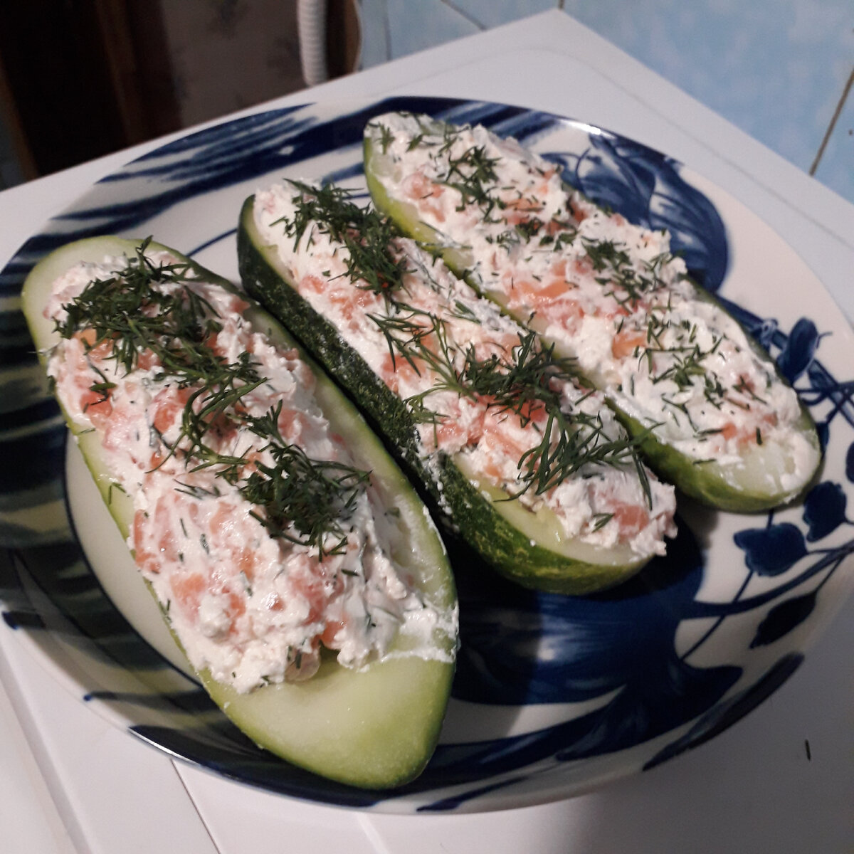 Летом, в жару, кушать не очень хочется но, вот что совсем не хочется делать, так это стоять у плиты.Но есть нужно и в голову приходят самые неожиданные рецепты. Предлагаю Вашему вниманию закуску из огурца рецепт приготовления которой пришел на даче во время поедания свежего и очень сочного, отлично удаляющего жажду огурчика, и брошенного на грядку с кабачками взгляда. Мне понадобится очень простой набор продуктов.Это творожный сыр, укроп, слабосоленая форель и, конечно же, огурец! Форель нужно нарезать чем мельче тем лучше. Огурец режем пополам и чайной ложкой делаем из него лодочки, ну как делаем их из кабачков.Серединку можно пустить на салат а можно и просто съесть!Также я мелко рублю укроп и делю его на две, примерно равные, части. В миске соединяем рыбку, половину укропа и творожный сыр.Можно посолить по вкусу но, как правило, сыр уже достаточно соленый. Все ингредиенты тщательно перемешиваем и у нас получается начинка. Чайной ложкой помещаем начинку внутрь наших лодочек из огурчи