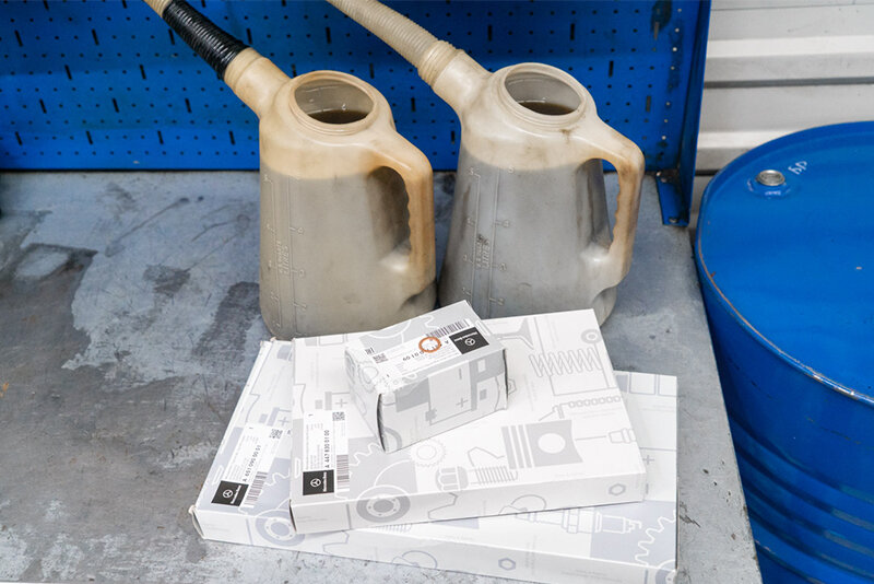 Стильные минивэны Mercedes W447 пользуются хорошим спросом за счет высокой степени комфорта и надежности. Эти автомобили регулярно обслуживаются в нашем техническом центре. В списке популярных процедур – замена моторного масла, обслуживание тормозной системы и замена расходных деталей подвески. На этот раз к нам на плановое ТО приехал владелец дизельного Mercedes V220 d. Наши специалисты выполнили стандартные работы, включая замену масла в двигателе и фильтры, а также заменили задние тормозные диски и колодки. С учетом пожеланий клиента в ходе стандартного обслуживания использовались оригинальные комплектующие и моторное масло. В качестве замены тормозных дисков и колодок применялись аналогичные расходники от Zimmermann. Как обычно, выполняем компьютерную диагностику, осматриваем агрегаты автомобиля, ходовую часть, проверяем состояние технических жидкостей. После этого переходим к выполнению работ: сливаем моторное масло и приступаем к замене фильтров. Выполняем замену и установку масл