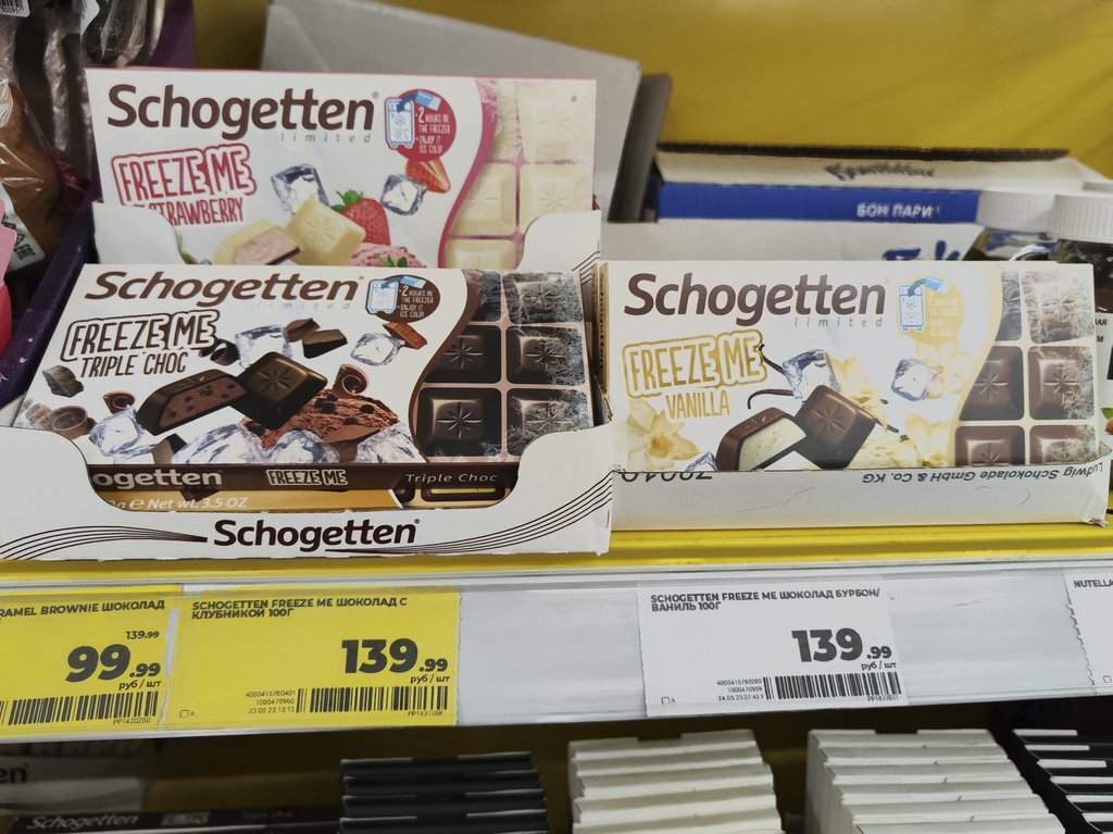 Традиционный по субботам пост про продукты А пока третью неделю в Саратове держится температура +32 и выше, хочется в холод. И о лимитированной серии шоколада для замораживания я уже немного рассказывал. Но теперь взял на пробу все варианты, и теперь полная версия. Итак, этим летом в продажу поступила лимитированная коллекция «Freeze me» с тремя разными вариантами. Типа заморозь в течение двух часов в морозилке и ешь как мороженое. Ну давайте попробуем. Купил ванильный вариант. В составе неожиданно рапсовое масло, вместо традиционного пальмового. В целом состав неплох. Внутри — всё, как в обычной плитке Schogetten — дольки отдельно. Т.к. я шоколад храню в холодильнике (в комнате при круглогодичных +27-31 шоколад хранить нельзя, сразу превращается в воду — завидую людям, живущим в холодных домах или на теневой стороне), то начинка оказалась тягучая, как в советских шоколадных батончиках. Помните такие ужасные с пальмовым маслом вместо начинки и заменителями вместо шоколада. Да они и сей