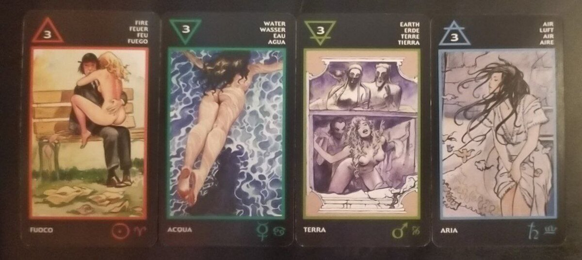 Все тройки в Таро Манара говорят о мыслях и отношении партнёров друг к другу, часто скрытом и недосказанном. Тройки - это энергия внутренних переживаний, человек уже делает выбор, который был ему предоставлен двойками до этого. Тройки символизируют подсознательное восприятие одного партнёра другим. Тройка огня Тройка огня символизирует активность, нетерпение, быстрое развитие событий. Женщина испытывает страсть и желает получить всё и сразу, невзирая на внешние обстоятельства и мнение партнёра по этому поводу. Она привыкла добиваться своего и не намерена отступать. Карта олицетворяет импульс одного партнёра и безынициативность, смирение другого. Азарт, агрессивный напор, завоевание, но останется ли он интересен ей, когда она получит всё, что хотела? Ключевые слова карты: активность, открытость, настойчивость, внимание, завоевание, дисбаланс. Перевёрнутое значение: нерешительность, закомплексованность, стеснение, заниженная самооценка, сопротивление. Отношения неравноправные, один из па