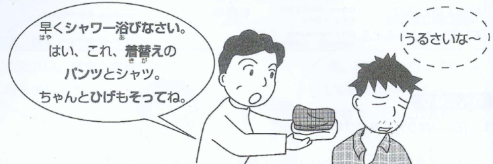 Собираемся (куда-то на выход) ・早くシャワー浴びなさい。はい、これ、着替えのパンツとシャツ。ちゃんとひげもそってね。