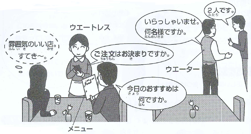 Пойдём поедим ・雰囲気のいい店。すてき~。 - Какая приятная атмосфера в этом кафе!Замечательно! ・ご注文はお決まりですか。 - Вы готовы сделать заказ? ・今日のおすすめは何ですか。 - Что посоветуете сегодня? ・いらっしゃいませ。何名様ですか。- Добро пожаловать! Сколько вас человек? ・二人です。 - Двое. ウエートレス - официантка