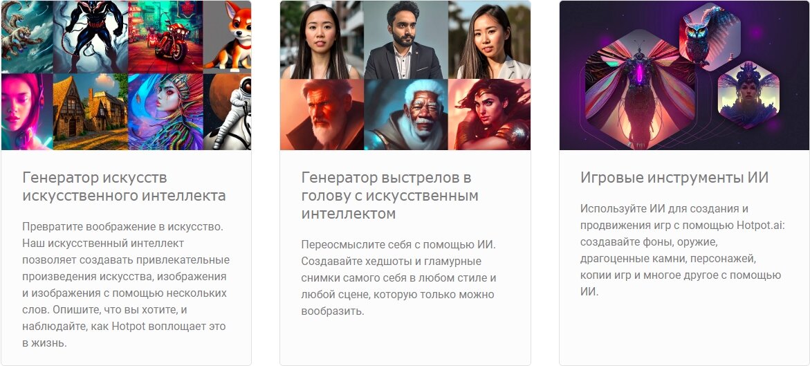 Hotpot.ai предлагает широкий спектр функций и инструментов. Пользователи могут выбирать из различных стилей, шаблонов и эффектов, чтобы настроить внешний вид создаваемых изображений. Перечень основных функций сервиса Hotpot.ai: • Генерация изображений по текстовому запросу пользователя