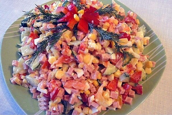 1 баночка кукурузы консерв. 1 красный болгарский перец 2-3 свежих огурца 3 вареных яйца 200г ветчины зелень,майонез по вкусу Приготовление: Шаг 1. Яйца очистить , мелко нарезать. Сладкий перец, огурцы, колбасу нарезать кубиками. Из кукурузы слить жидкость. Шаг 2. Яйца , перец, огурцы , ветчину, кукурузу соединить и хорошо перемешать. Шаг 3. Салат заправить майонезом по вкусу, вновь перемешать и выложить на блюдо. Украсить можно зеленью и подать к столу . Очень вкусный и легкий салатик. Готовлю его почти каждый день , и всей семье нравиться, так что готовьте, и не пожалеете . Смотрите мой канал много новых и простых рецептов! Буду рада вашим отзывам !