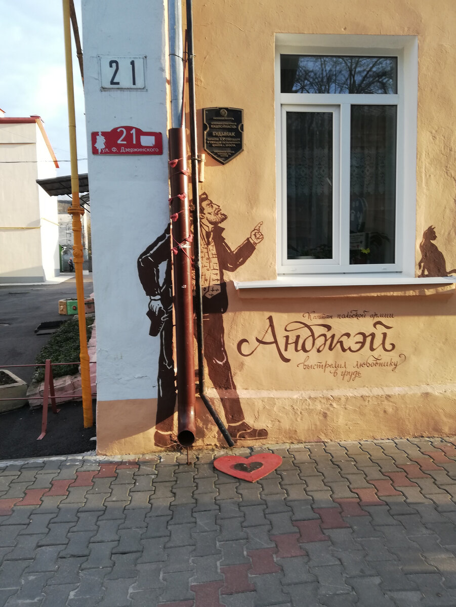Настоящая трагедия, достойная пера Шекспира, разыгралась на улице Дзержинского по старому стилю улица Кривая, дом 21 ,что находиться в Бресте. Жили были, поживали, добра наживали семейная пара: офицер польской армии Анджей и белошвейка Вацлава. Скучно было Вацлаве и завела она любовника Григория , он же Гога, он же Гоша, он же Жора, грузина одним словом. И вот пока пожилой муж спал на первом этаже, Жорик приловчился по водосточной трубе забираться на второй этаж к своей пассии. В одну ночь Анджея разбудили посторонние звуки доносившиеся со второго этажа. Анджей оделся и вышел покурить на улицу. Когда трубка была почти выкурена, Анджей увидел спускающегося по водосточной Жоржика. Вихрем пронеслись в голове оленя мысли, он все понял и одним выстрелом убил Жорика. Вацлава не выдержала смерти возлюбленного и на утро приняла яд. Вот такую историю историю я прочитал и посмотрел на стенах одного дома в Бресте. А Анджей завербовался в польский легион к Пилсудскому и сгин