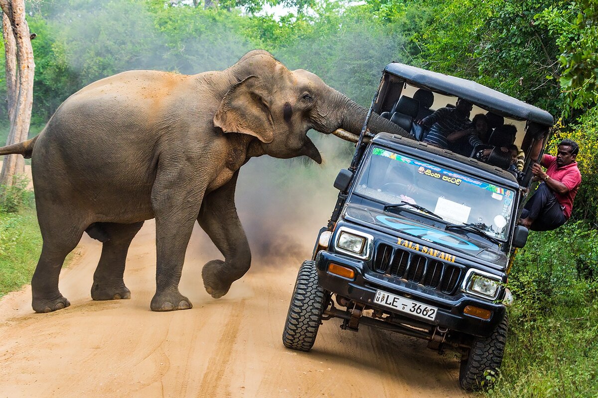 "По моим предположениям, мирно пасущийся у дороги слон решил проверить джип с туристами на предмет еды. Водитель не успел среагировать на слоновий интерес и уехать. Слон заблокировал машину и, не дождавшись угощения, изрядно разозлился, едва не перевернул джип, полный людей. Наша машина была впереди атакованной, съемка велась на ходу".