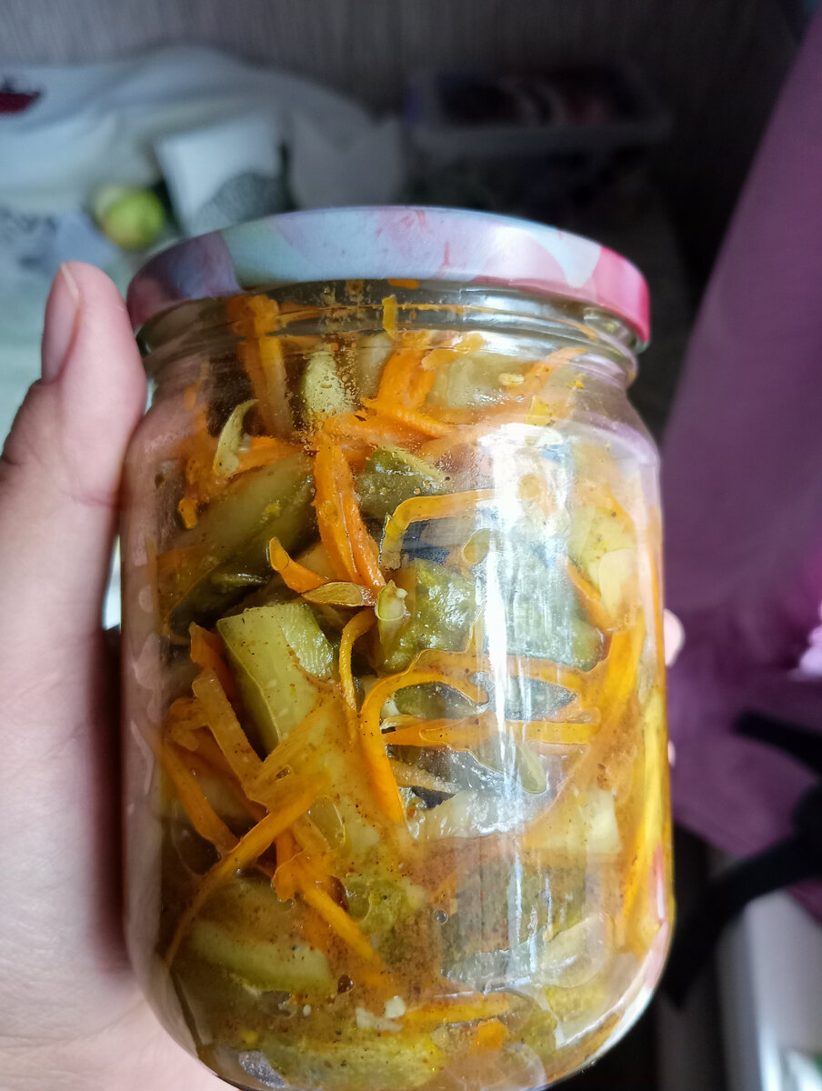 Вдогонку к рецепту "корейских" кабачков. Рецепт удачный, рабочий, готовила по нему несколько сезонов. Ингредиенты: Огурцы с кожурой нарезать небольшими брусочками, морковь натереть на тёрке для корейской моркови, чеснок нарезать тонкими пластинками. Перемешать, засыпать и залить всеми составляющими маринада, ещё раз тщательно перемешать и оставить мариноваться на 1,5-2 часа. В маринад можно добавить пару ложек соевого соуса. Переложить в чистые стерилизованные банки и поставить в кастрюлю стерилизоваться. Банки объемом 0.5-0.7 литра стерилизуем 15-20 минут, объемом 1 литр и 1.5 литра-30 минут. Приятного аппетита !!!