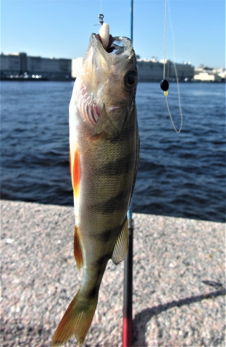 Утречком 12 августа в субботу я выбрался на Неву к 8 часам утра. Оказалось, что, те места на которые я претендовал, уже заняты. Вспомнилось, что когда ПКР проводил соревнования «Невский судак», я на берегу встретил рыбачку, натягавшую мешок окуней. Я попытался найти то её место – получилось. Окушки стали у меня весело клевать, предпочитая «бутерброд» (червь с опарышем) отдельным червякам. Невские окуни здорово проигрывали в размере тем окуням, что мы месяц назад ловили с Палычем на Выгозере. Поэтому я действовал по принципу «поймал – отпусти». Утомляли любопытные туристы, гуляющие толпами по набережной: «А кого Вы ловите?» «Рыбу» «А какую рыбу?» «Живую». «И что здесь водится?» «Таких как ты уже штук двадцать клюнуло!» Надо будет изготовить плакат с вопросами и ответами. Потом я оказался свидетелем интересного мероприятия на водах Невы. За моторной лодкой вниз по течению плыли два пловца. Каждый в сопровождении страхующего на надувной доске. К каждому пловцу был привязан надувной ша