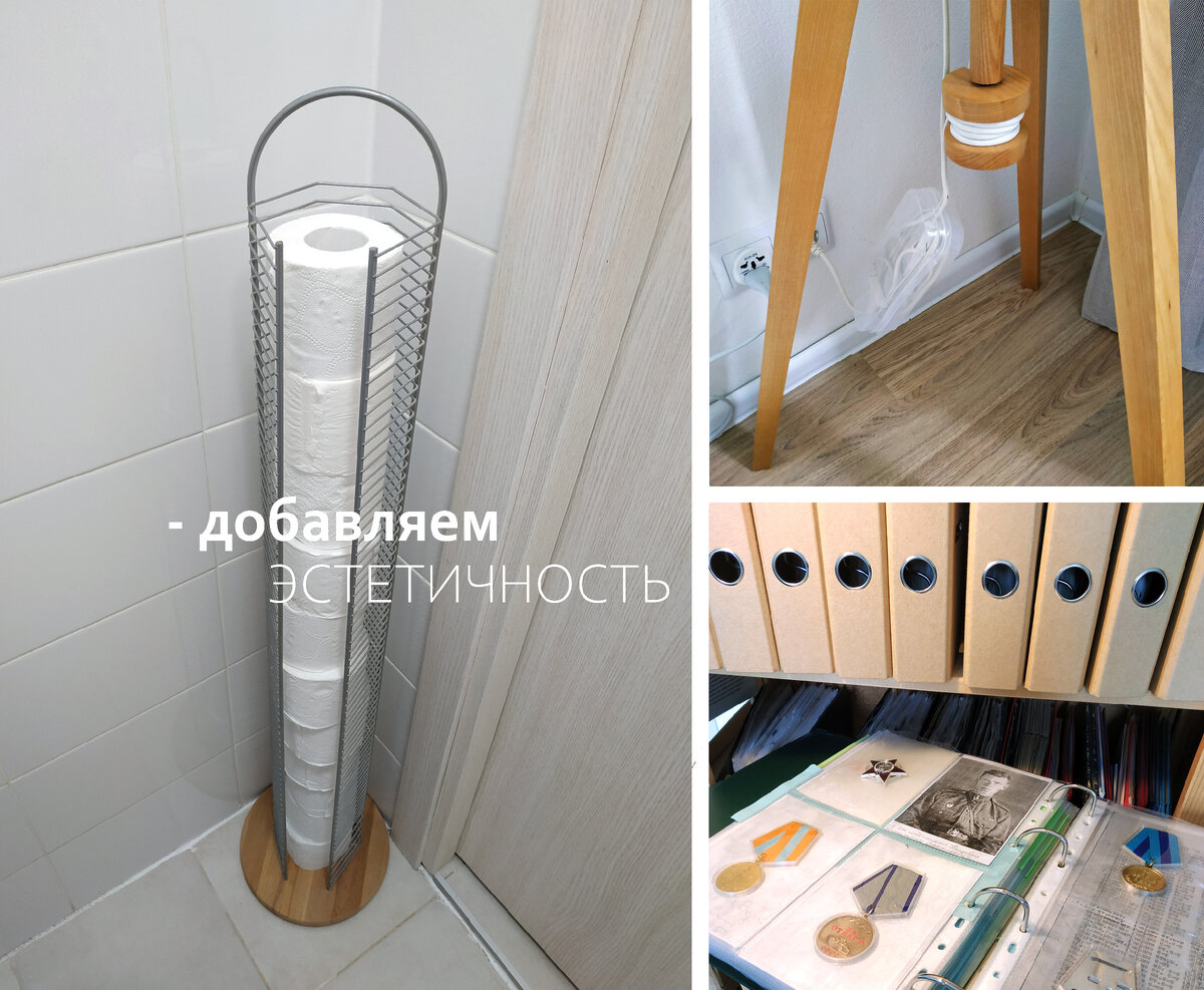 1. Эстетичное хранение проводов в школьном пенале Органайзер для хранения проводов поможет навести порядок в интерьере, скрыв различные провода и делая хранение более эстетичным. В настоящее время доступны различные модели - на любой вкус и кошелек. Но, можно сделать органайзер своими руками, для этого подобрать коробочку подходящего цвета и размера. В моем случае школьный пенал. Затем несложные манипуляции с прорезанием отверстия для прохождения провода. И органайзер готов! 2. Организация хранения туалетной бумаги в стойке для компакт-дисков С уменьшением значимости компакт-дисков, отпала необходимость и в различных конструкциях для их хранения. Данная напольная стойка-органайзер для компакт-дисков позволяет разместить большой запас туалетной бумаги. Кроме того стойка компактна и прекрасно вписывается в небольшое помещение. Только деревянное основание пришлось заменить. Оно имело многоугольную форму и на ней были неустранимые пятна. Я приобрела подходящую разделочную доску из массива