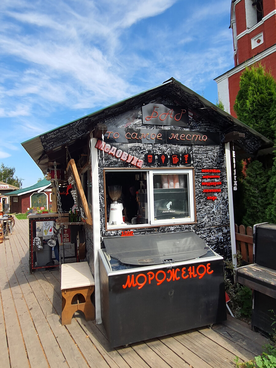 Идём дальше по Кремлевской улице в направлении Кремля. И попадаем на "Подворье Мастеров" Это пространство, заполненное маленькими домиками, с магазинчиками и кафе внутри,крошечным рынком с сувенирами и маленькой площадью для представлений. На подворье есть качели, тенистые уголки со скамейками для отдыха, веранды с видом на реку Каменку и много-много цветов. На входе вас встречает избушка на курьих ножках. Он же бар "То самое место" Оформлен креативно. И главное -- недорого. Основные затраты похоже на вывеску. Но это отлично! Ребята, молодцы! Придумали оригинальный дизайн, сами похоже построили павильон. Зарабатывают. Приветствую подобные проекты. На крошечном рынке очень понравились изделия с использованием павловопосадских платков -- теплая домашняя обувь, теплые жилеты. Для поступающей осени актуальные вещи. Особенно в сельской местности. Поздней осенью и глухой зимой разноцветные тапочки и жилеты добавят не только тепла для тела, но и цвета, и настроения для души. Теплые валяные т