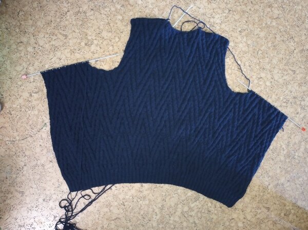 Предыдущую статью по вязанию мужского жилета с высоким горлом я закончила такими словами "Не убавляя, не прибавляя я буду вязать полотно до проймы рукавов. По моим меркам это 38 см с учетом резинки." И такой фотографией Продолжаю. Вяжу еще 2 см и приступаю к вывязыванию пройм рукавов. На спицах у меня по-прежнему 200 петель. От начала ряда провязываю 50 петель правой полочки и закрываю 3 петли для правой проймы спинки. Довязала ряд до конца. Развернула вязание, провязала 50 петель левой полочки, закрыла 3 петли для левой проймы спинки. По 50 петель справа и слева сняла на булавки. Вязание продолжила на средних 94-х петлях (200-50-3-50-3=94) Для проймы спинки в начале каждого ряда закрыла еще один раз по две петли и один раз по одной петле. На рабочих спицах осталось 88 петель (94-2*2-1*2=88). Всё, с проймами спинки закончила. Дальше вяжу ровненько до горловины спинки. От начала вязания 80 см Ширина плеча в этой модели 15 см. Плотность вязания 18,5 петель в 10 см. Следовательно на