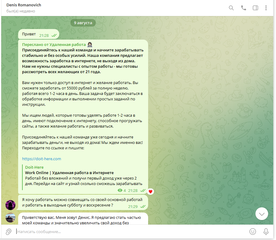 Данный товаришь предлогает регестрацию на брокере binoptclub.com , а данный брокер уже давно в черном списке брокеров . Суть мошенничество данного товариша заманить на сайт ,а затем пополнить счет вашего депазита черного брокера и как только вы будите ставить его деньги или же свои вы проиграете так как брокер не даст вам заработать . Ссылку на переписку ставлю здесь : file:///C:/Users/User/Downloads/Telegram%20Desktop/ChatExport_2023-08-13/messages.html Ссылку на контакт ставлю здесь :