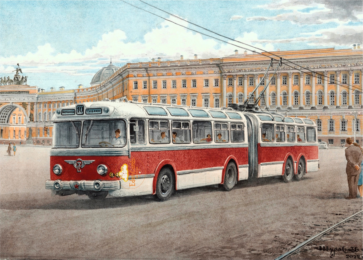 Московский наземный электротранспорт 1980-х годов, работа от 2023 года. Кстати, работа отображает переходный период московского транспорта от одной стандартной окраски к другой - троллейбус на переднем плане красно-белый (кремовый), на заднем уже голубо-белый.