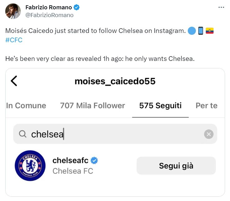 Упс. Продолжается одна из главных трансферных саг этого лета м переход Мойсеса Кайседо из «Брайтона» в «Челси». Лондонцы уже сделали несколько предложений по талантливому эквадорцу, но все они были отвергнуты. После этого в гонку ворвался «Ливерпуль», который был готов выложить за Кайседо 127 млн евро, но игрок сам отказался от трансфера, заявив, что хочет играть только в «Челси». Тем временем король футбольных инсайдов Фабрицио Романо написал в своем твиттере, что Кайседо уже подписался на инстаграм «Челси», что в наши времена считается признаком скорого перехода. Только выяснилось, что Романо ошибся, и Касейдо был подписан на «Челси» и раньше. После этого под твитом Фабрицио появилась плашка о том, что футболист зафолловил аккаунт клуба еще в январе 2023 года. Что тут сказать, даже такой авторитетный журналист, как Романо, иногда ошибается.