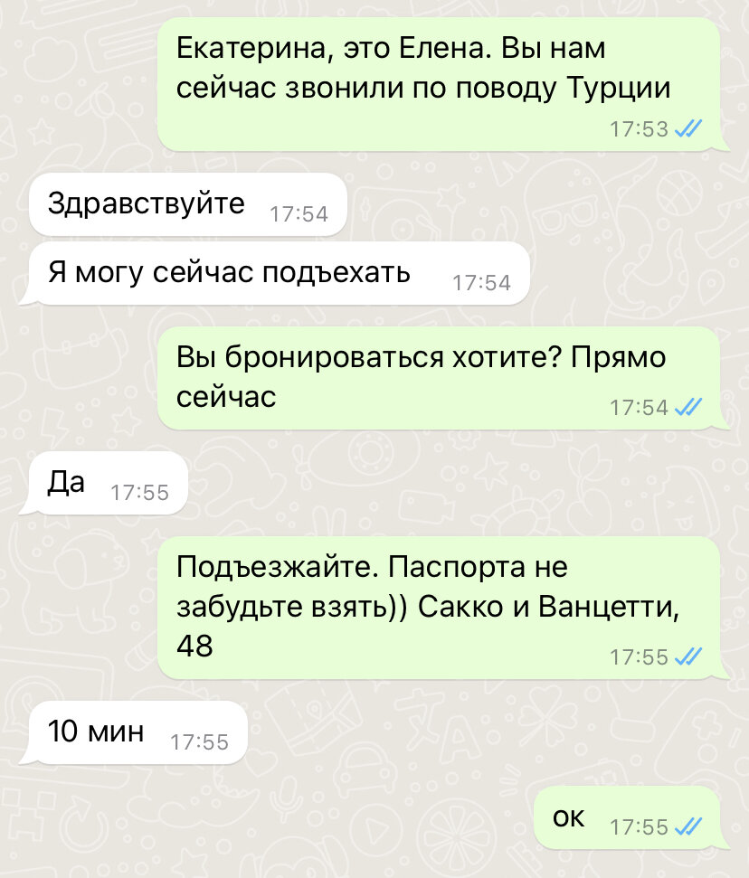 Ок, пишу ей на ватсап, в ответ отели она мне не скидывают, а пишет сразу, что готова прямо сейчас подъехать, через 10 минут.