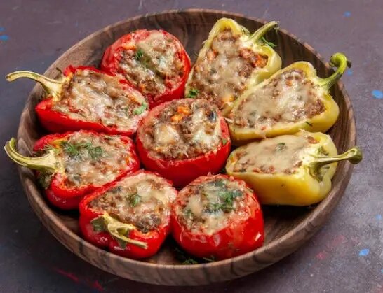- Отрежьте верхнюю часть перцев и удалите семена и перегородки. Наполните каждый перец приготовленной начинкой и плотно закройте верхнюю часть перцев.