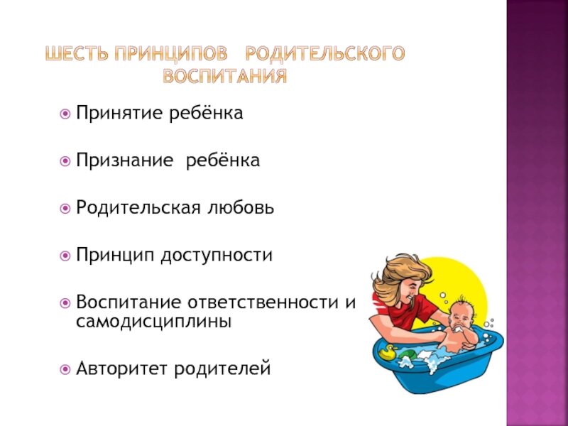 Воспитание детей через принятие. Рассказывает психолог Наталья Фещенко Все, чтобы вы не предпринимали в отношении своего ребенка в воспитательных мерах, есть один важный принцип, без которого вам не удастся наладить отношения с ним. Это безУсловное принятие его. Это проявление любви Без Условий. Любить не за что-то, например, за красоту, за ум, за то, что он вам помогает, а просто так, просто потому, что он у вас есть. А знаете ли вы, что, чем больше вы ругаете своего ребенка, тем хуже он постепенно становится? Это происходит потому, что не следует заменять воспитательный процесс дрессировкой его поведения, выработкой у него определенных рефлексов. Главная человеческая потребность – это потребность в любви и быть нужным кому-то. Ребенок адекватно развивается, если его потребность в любви удовлетворена. А это случается тогда, когда ваш ребенок слышит от вас, что вы им дорожите, что вы нуждаетесь в нём, что он такой, какой есть, что он - хороший. Говорите своему ребенку, что вы соскучил