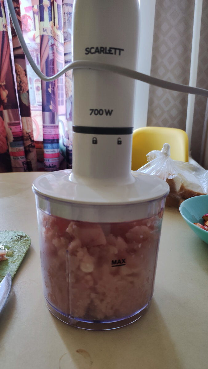 Вчера мы с Тасей ходили в гости к бабушке (моей маме) и взяли у нее на временное пользование блендер. Наш блендер с маленькой, узкой чашей и подходит в основном для пюрирования небольшого количества ягод, варёных овощей. Хорош он для приготовления смузи, справляется с измельчением сырых круп для каши - риса, гречки. В мамином блендере чаша широкая, плюс можно присоединить погружную часть. Я разморозила две ̶ф̶и̶л̶е̶н̶о̶е̶ ̶к̶у̶р̶е̶ куриные филешки, измельчила их в мамином блендере, добавила мелко натёртую морковь, яйцо, немного соли. Фаршик получился совсем не такой, как в мясорубке, более мягкий и нежный. Я довольна. Из части фарша накатала малюсеньких фрикаделек и сварила Тасе супчик - фрикадельки, одна мелко порезанная картошка, макарошки-звёздочки. Супчик Тасе понравился. Из остального фарша сделала около десяти котлеток и несколько маленьких фрикаделек. Всё это сложила на доску и отправила в морозилку. Из фрикаделек потом можно сварить супчик, а котлетки по одной-две штучки
