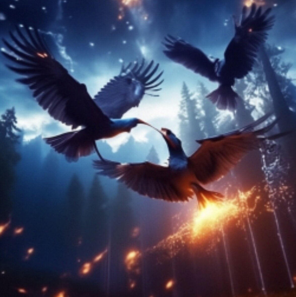 РАЙКИНЫ СКАЗКИ. ЧАСТЬ ДЕСЯТАЯ. Наступил день битвы. Райка волновалась, но вида не показывала. Маланья с утра, сварила отвар для заживления ран, приготовила 2 молодильных яблочка, и никого не пускала в избу. К обедне, во двор вдруг залетела та самая огромная птица, и покружив над избой вдруг сложила крылья и стала падать прямо на избу. Но она не упала на соломенную крышу, а прямо точно угодила в каминную трубу и потом в избе раздался лёгкий шлепок и из окон пошла пыль. Райка догадалась что это, прилетела её бабка Лукерья. До вечера старые ведьмы не выходили из избы, и тишина стояла такая, будто и вовсе внутри никого не было. К закату дверь избяная отворилась и на крыльцо вышли две молодые и красивые женщины, хлопнули себя по бокам ладонями и подпрыгнув вверх, вдруг превратились в больших птиц и взлетели над двором. Райка последовала их примеру, и взмыв в высоту стала удаляться от них, но старые ведьмы настигли её и поравнявшись полетели уже втроём. Они летели на поле битвы, дал