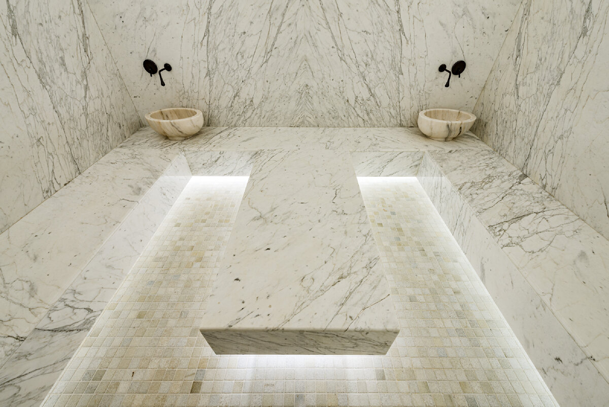 Для хаммама мы выбрали идеальный для материал - мрамор. Стены и лежаки выполнены из мраморных слэбов (плит), а пол и потолок куполообразной формы - из мозаики.