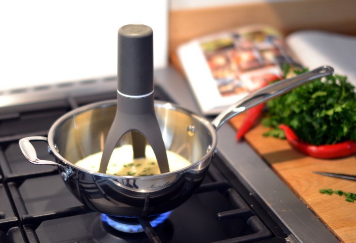 Автоматическая мешалка работает от электричества. Ее достаточно просто поместить в кастрюлю и включить, а дальше все сделает технология. Более того, такую мешалку можно использовать и в качестве миксера.