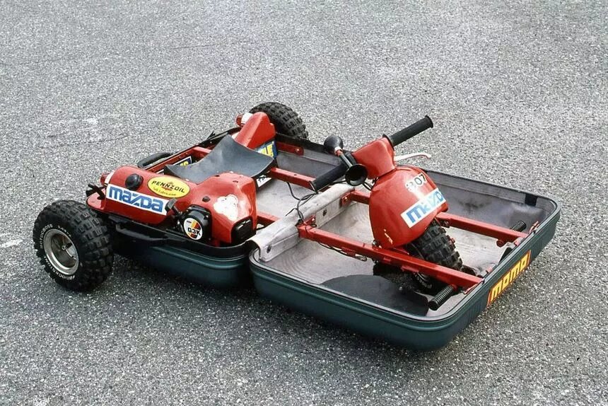 Когда-то мы уже писали о двух миниатюрных скутерах, которые запросто можно было взять с собой в качестве запасного транспортного средства: скутер-чемодан Valmobile и Honda Motocompo, которому с завода предопределили место в багажнике Honda City. Добавим в их миниатюрную компанию еще одного участника Mazda Suitcase. Из кейса в машину за минуту Эта история восходит где-то к началу 1990-х, когда солнце было ярче, а трава зеленее. У Mazda тогда дела шли весьма неплохо, компания могла себе позволить потратить ресурсы на что-то, что вовсе не обязательно должно окупиться. Так зародилось внутреннее соревнование Fantasyard, где команды должны были придумывать мобильный транспорт будущего. Насколько эти идеи соотносились с реальным миром – вопрос вторичный, главное – проявить фантазию и смекалку. А там, глядишь, что-то из наследия и пригодится когда-нибудь. Легенда гласит, что команда из семи человек, которые занимались тестированием и изучением трансмиссии, решила подойти к задаче творчески и «