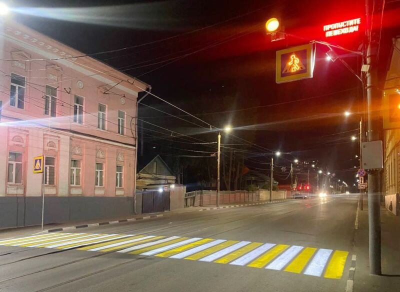 В Туле на улице Оборонной появился умный пешеходный переход. Система включает в себя световую зебру, которая проецируется на дорогу. При приближении пешехода к умному переходу срабатывают видеодетекторы, и загорается табло «Внимание, пешеход». Одновременно включается дополнительное освещение.