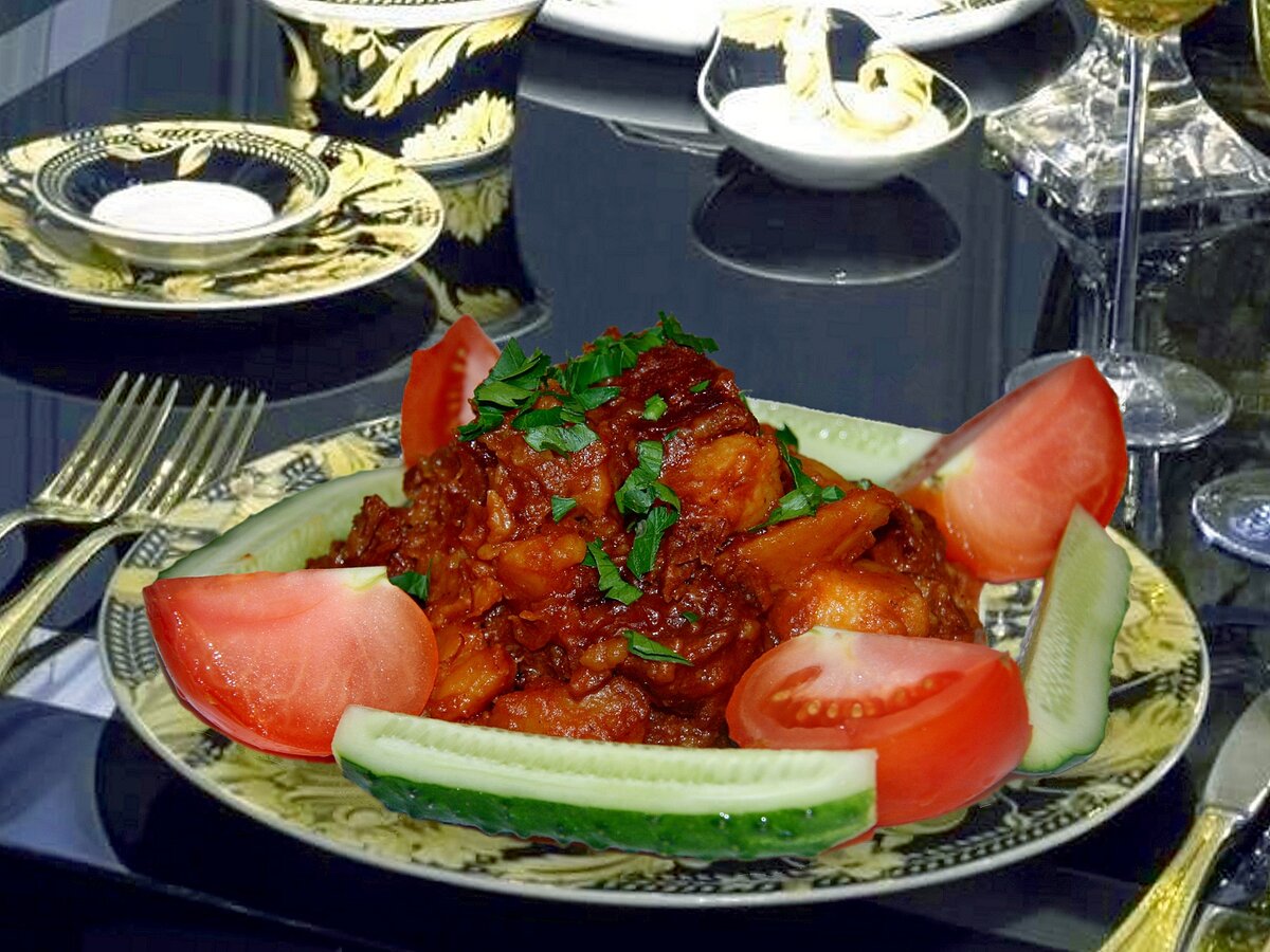 Рецепт для любой мультиварки. Я готовила в REDMOND-4502. Продукты Говядина - 600 г Картофель - 800 г Лук - 1 шт. Томатная паста - 1 ст. л. Чернослив без косточек - 60 г (9 - 10 шт.) Лавровый лист - 1 шт. Перец горошком Масло сливочное или маргарин Вода - 1,5 мультстакана Соль - 1 ч. л. Приготовление 1. Установить программу «Мультиповар» на температуру 140 градусов или «Жарка». Положить в чашу масло или маргарин, растопить. 2. Обжарить кусочки говядины. 3. Добавить лук, обжарить. 4. Положить томатную пасту, довести до кипения. Программу выключить. 5. Добавить картофель, целый чернослив, перец, лавровый лист. Перемешать. 6. Залить подсоленной водой. Установить программу «Тушение» на 2 часа. 7. После сигнала разложить по тарелкам, посыпав жаркое мелко нарезанной зеленью. 8. Можно добавить свежие овощи. Похожие блюда: