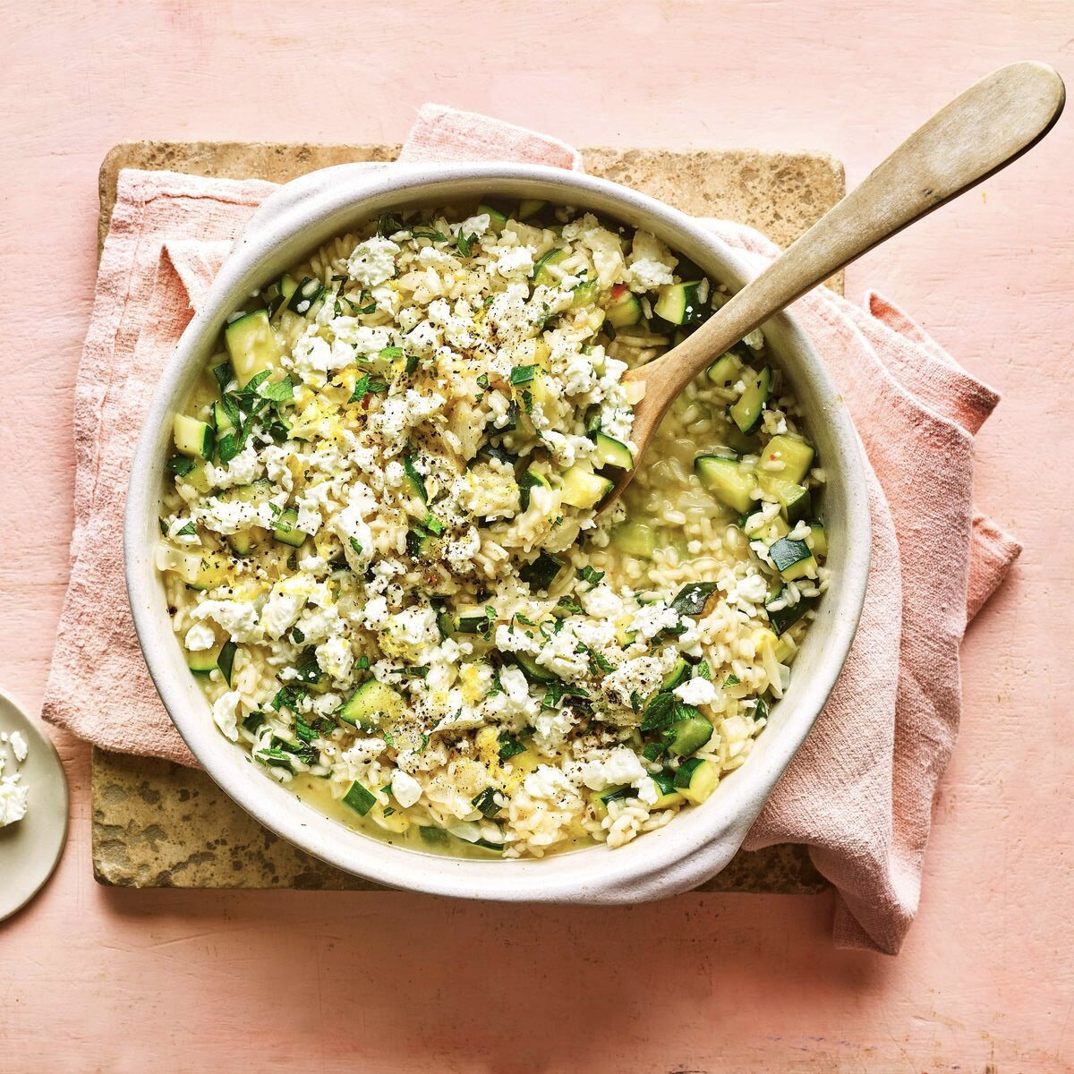 Это простое ризотто запекается в духовке, поэтому вам не нужно долго стоять и помешивать его на горячей плите. Жареные кабачки добавляют гарниру свежести и сочной текстуры, а фета дарит чудесное сливочное послевкусие. 4 порции Время на подготовку: 20 минут Время приготовления: 40 минут Общее время: 1 час Питательная ценность на порцию: 556 ккал, белков 17 г, жиров 21 г (из них насыщенных — 10 г), углеводов 68 г (в том числе сахара — 6 г), клетчатки 4 г. Ингредиенты: 2 ст.л. оливкового масла 25 г сливочного масла 3 средних цукини — не чистите, просто нарежьте кусочками толщиной в 1 см 3 зубчики чеснока — измельчите Мелко натертая цедра 1 лимона Маленькая горсть листьев мяты — мелко нарежьте плюс дополнительное количество для украшения блюда 1 луковица — также мелко нарежьте 300 г риса для ризотто 125 мл белого вина 800 мл овощного бульона* *Для приготовления овощного бульона воспользуйтесь советом: *Можете заменить куриным**, если хотите. **О французских принципах варки бульона