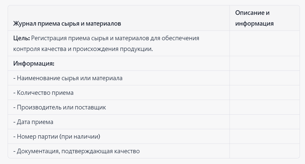 Журнал приема сырья и материалов: В этом журнале регистрируется прием сырья, материалов и ингредиентов, указывая их наименование, количество, производителя, дату поступления и прочие детали. Это важно для отслеживания происхождения продукции и обеспечения ее качества. Журнал производственных операций: В этом журнале фиксируются все операции, проводимые на производстве, включая этапы приготовления, обработки, упаковки и т.д. Это позволяет отслеживать каждый этап производственного процесса и обеспечивать его соответствие технологическим нормам. Журнал контроля качества: В данном журнале регистрируются результаты контроля качества продукции на разных этапах производства. Это включает