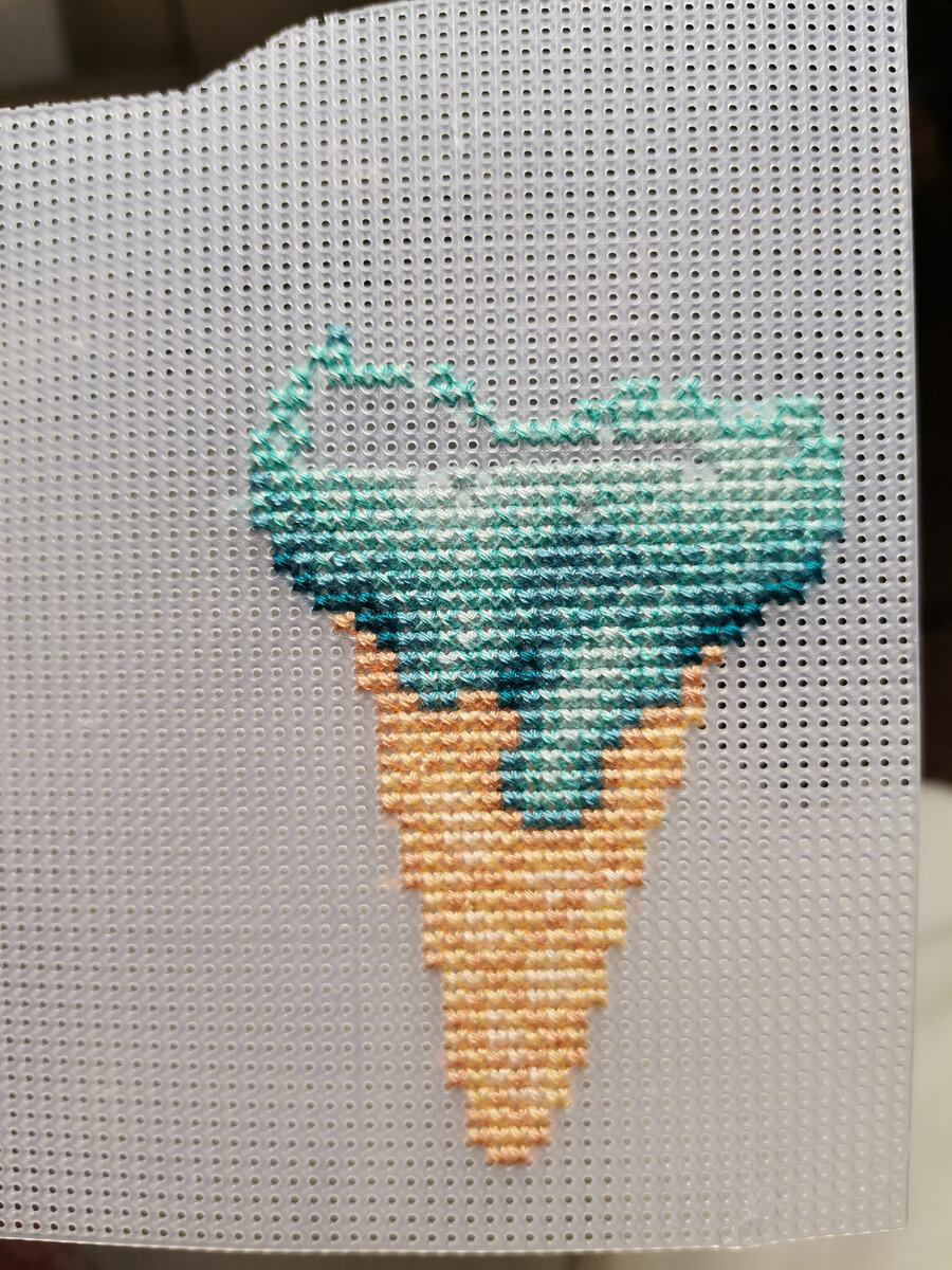 На этой неделе получилось совсем немного повышивать. Первая неделя после отпуска была очень тяжёлой в плане работы, накопилось много бумаг, приходилось даже оставаться и во нерабочее время. Однако, мне это не помешало начать новенькую мелочь, из которой хочу сделать магнитик. Схема взята из интернета, ниточки подобраны из своих остатков. Будет в будущем мороженка.