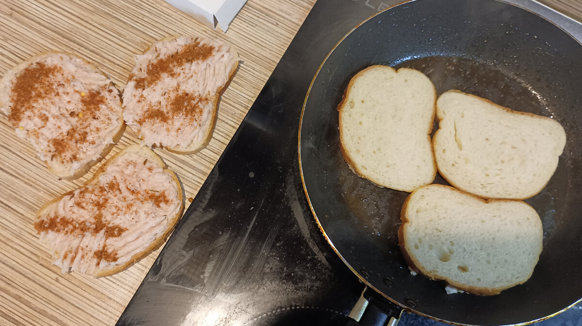 Здравствуйте. Несколько раз уже упоминала эти рецепт/ы. Не знаю, есть ли такой, но я до него сама додумалась) Раньше дома намазывала фарш на хлеб, потом обваливала во взбитом яйце и жарила на сковороде. Напоминает вкус из макдональдса, особенно хлеба в этом составе такой вариант. Потом, здесь я намазывала куриный фарш и жарила на сковороде сначала фаршем вниз + специи. Потом на другую сторону. Можно сверху ещё чего нибудь добавить. И под крышкой немного и готово. На очередной воскресный завтрак вновь решила эти бутерброды делать. В духовке и как стожки. Стожки - это фарш, начинка и соленая тертая картошка сверху отжатая от влаги. Запекается в духовке. А вот фото моих бутербродов по этому принципу. 400 г фарша ушло на почти батон хлеба И 2 средних сырых картофелины. В духовку на 180 градусов и 40 минут. Картофель сверху начинает золотится - точно всё готово. Идём на кухню. И едим с овощами. Хлебный ободок получается хрустящим. А внутри мякиш от фарша не сохнет. И при такой температуре и