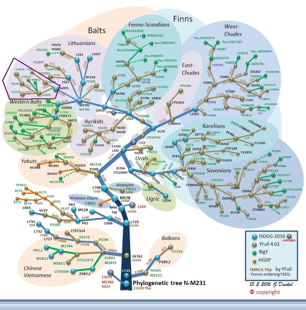 Доля финно угров, среди носителей гаплогруппы N, всего 1,5%. Таким образом нет никаких оснований считать её финно угорской. В Европе, гаплогруппа N представлена тремя ветвями. Это финская -N1а1-CTS9976, распространена среди финно язычных народов Европы и у казанских татар, которые в своей основе это поволжские финны, принявшие ислам и перешедшие на татарский язык. У русских данная ветвь не встречается. В Европу пришла из Западной Сибири около 500 года новой эры. Балтийская - N1а1-L1022. Пришла в Европу около 2 тысяч лет назад. Сейчас встречается у литовцев и латышей в доле 40%. В небольшом количестве встречается у поляков, белорусов и украинцев. У русских не встречается. Русская или славянская - N1а1-Y4343, занесена в Европу примерно 3 тысячи лет назад небольшой группой мужчин, которые смешались с жившими здесь носителями субклада R1aZ280. В настоящее время встречается у 14% русских, у 10% белорусов, у 8% украинцев и поляков и у 4-6% славян южного берега Балтики. Это резуль