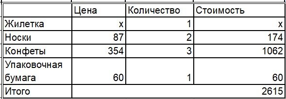 Задача на расчет стоимости покупки: Лев Георгиевич пришел домой и понял, что забыл узнать цену жилетки, которую он купил в подарок своей внучке на день рождения. Кроме этого он купил себе двое носков по цене 87 рублей за штуку, три коробки конфет по цене 354 рубля за коробку и упаковочную бумагу за 60 рублей. Но он помнил, что за всю покупку заплатил 2 615 рублей. Сможет ли Лев Георгиевич, имея такие данные узнать цену жилетки?