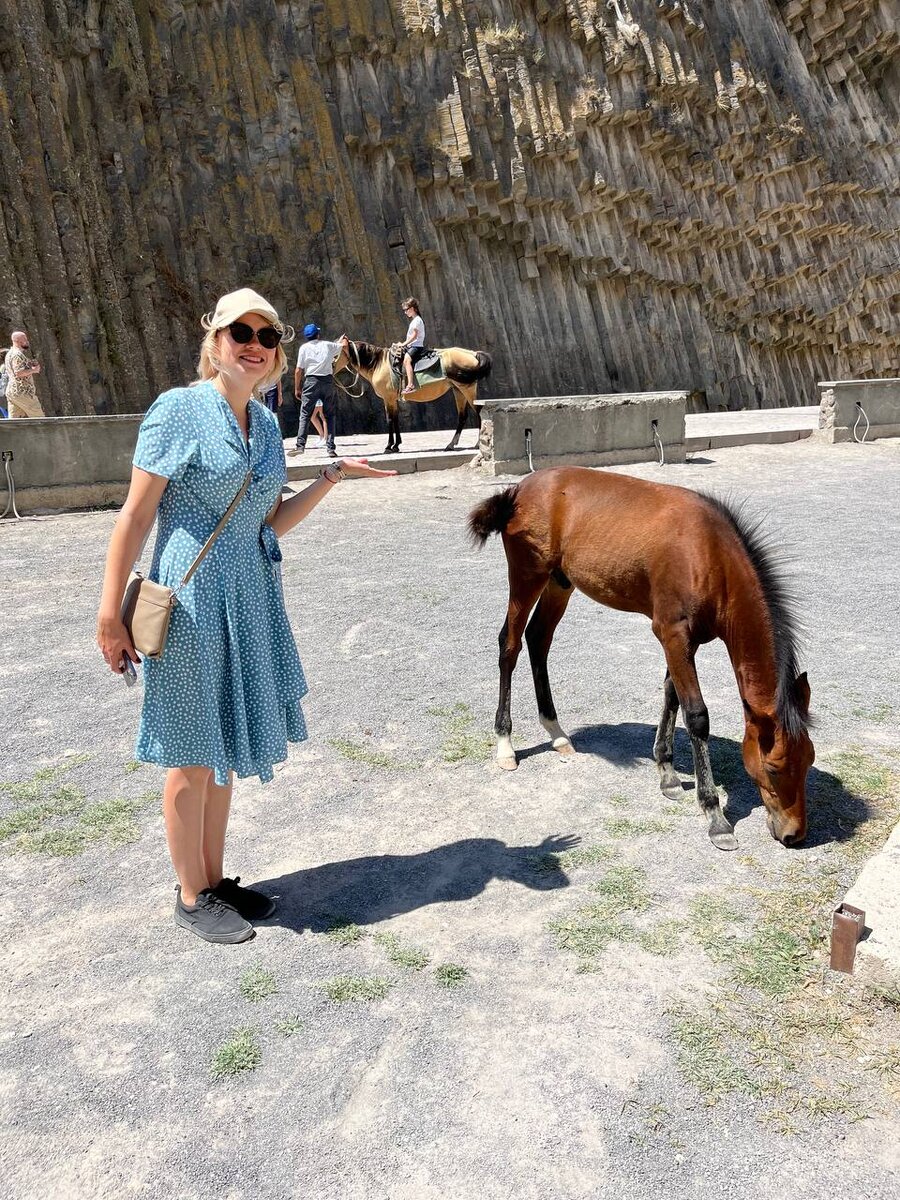 на самом деле не очень😁 что же здесь происходит? «Симфония камней» недалеко от Еревана- ущелье в горах, где базальтовые столбы идеальной геометрической формы достигают высоты 50-ти метров. Зрелище, конечно, завораживающее: за счет масштабов создается ощущение бесконечности такой невероятной природы. Пора двигаться дальше: как оказалось, приключения только начинались. Чтобы дойти до следующей локации, нужно пересечь всё ущелье и подняться на гору, где в первом веке нашей эры был построен древний языческий храм. Первая часть дороги была приятной: по ровной дороге с тенёчком, по пути встретился заброшенный фруктовый сад и заросли тутовника. Несмотря на сложность дороги, отлично прошлись, а вот в гору потом по жаре, конечно, тяжеловато.. В какой-то момент я поняла, что останусь «где-то там высоко в горах»😂 Но холодная водичка из горного источника спасла ситуацию. Потом наконец-то осуществили подъем до храма Гарни, что тоже очень впечатляет. Я даже не знаю, что больше: древняя архитекту