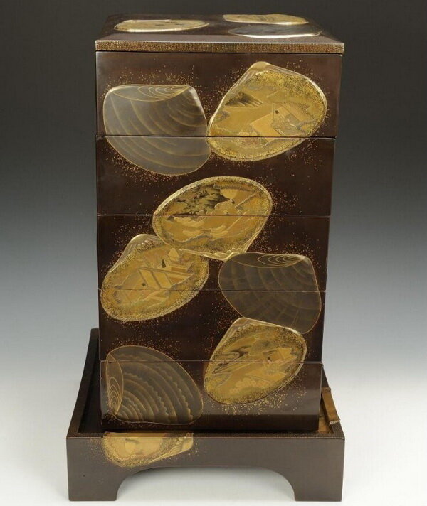 Шкатулка украшена изображениями раковин, разбросанных в живописном беспорядке. Некоторые раковины имеют естественный узор, некоторые украшены придворными сценами из романа XI века «Повесть о Гэндзи».