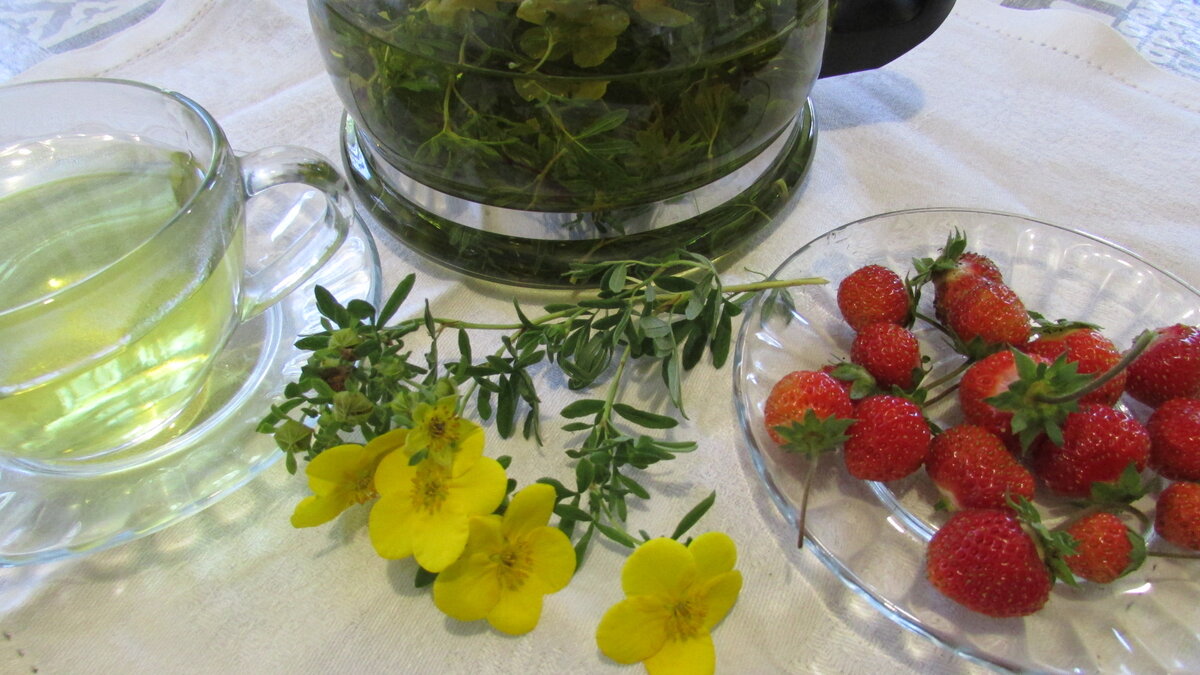 Еще одно из крутых дачных удовольствий, от которых невозможно отказаться, – это чай. Здесь масса всевозможных вариантов. Всякий раз можно добавлять в него что-то новое и прямо с огорода. Можно заварить с вишневым, малиновым или смородиновым листом, можно с мятой или чабрецом, можно для пикантности добавить в чайник терпкие плоды айвы дальневосточной или веточку иссопа. Или же сделать кипрейный чай из свежих листьев Иван-чая. Но сегодня я опять про чай курильский. Много лет уже растет лапчатка на нашем участке, и лишь в прошлом году я удосужилась ее заварить. О своем первом опыте я рассказывала вот здесь. И даже впервые насушила его на зиму. И теперь курильский чай основательно внедрился в нашу жизнь. Нет, мы пьем его не каждый день, ведь рядом еще куча всяких ароматных вкусностей растет, из которых можно сделать прекрасный напиток. Но изредка доставляем себе такое удовольствие. Завариваю я веточки курильского чая вместе с цветочками и непременно в прозрачном чайнике. Созерцая эту красо