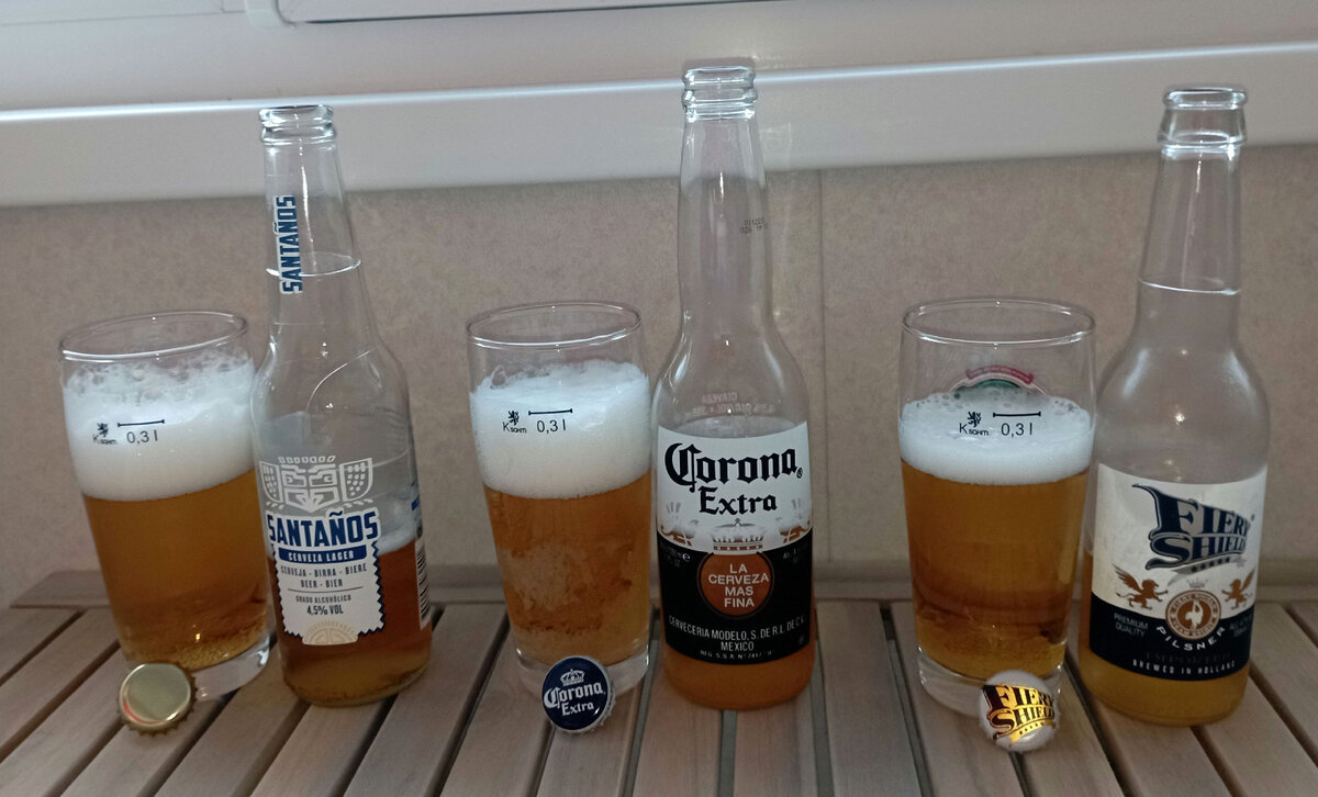 Пожалуй, нет такого любителя пива, который хоть раз не пробовал мексиканское пиво "Корона". Можно по-разному к нему относится, но нельзя не отметить, что это один из самых продаваемых сортов пива в мире. Лето - самое время для такого пива. Кстати, у "Короны" есть множество подражателей. Некоторые проблемы с поставками "Короны" стали причиной появления большого количества "коронозаменителей", как отечественных, так и иностранных. И хотя сейчас "Корону" можно без проблем купить практически везде, "коронозаменители" по-прежнему продаются. Спонтанно случился экспресс-тест - к двум "коронозаменителям" из Нидерландов и Эстонии (КиБ и "Чижик") был куплен оригинал. 1. Corona Extra. Алкоголь 4.6. IBU 18. Производитель Grupo Modelo, Mazatlán, Sinaloa Mexico Стиль - Lager - Mexican Дата производства - ? Дата дегустации - 04.08.2023 Оценка на untappd 3.12. 2. Fiery Shield. Алкоголь 4.7. IBU ? Производитель WineBridge Amsterdam. Netherlands Стиль - Lager - Mexican Дата производства - ? Дата дегуста