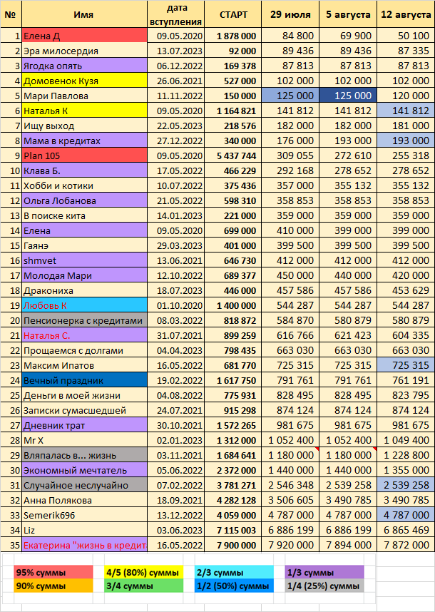Всем доброго времени суток))) Шучу-шучу, здравствуйте! Сегодня я задержалась, да и сейчас времени мало, поэтому буду кратко и по сути: Сегодня все большие молодцы, хотя в этот раз получилось многовато "прогульщиков" - 5 человек. Для сравнения, на прошлой неделе не явился всего лишь один участник. Кстати это была Мари Павлова, которая в этот раз успешно реабилитировалась и обнулила свои прогулы. Так что движемся дальше! Давайте же посмотрим, кто у нас попадает в лидеры этой недели: Экономный мечтатель погасила 85000р и заняла первое место! С большим отрывом второе место занимает Вечный праздник с результатом 30570р. А замыкает тройку лидеров Екатерина "жизнь в кредитах"- минус 22000р. Поздравляем! А вот как выглядит погашение за неделю в процентах от суммы: Экономный мечтатель, занимающая первое место по сумме погашения, в процентах оказывается лишь на третьем месте! Она погасила 5,9% от долга. На самом деле это не мало, просто первые места заняли участницы с гораздо меньшими суммами до