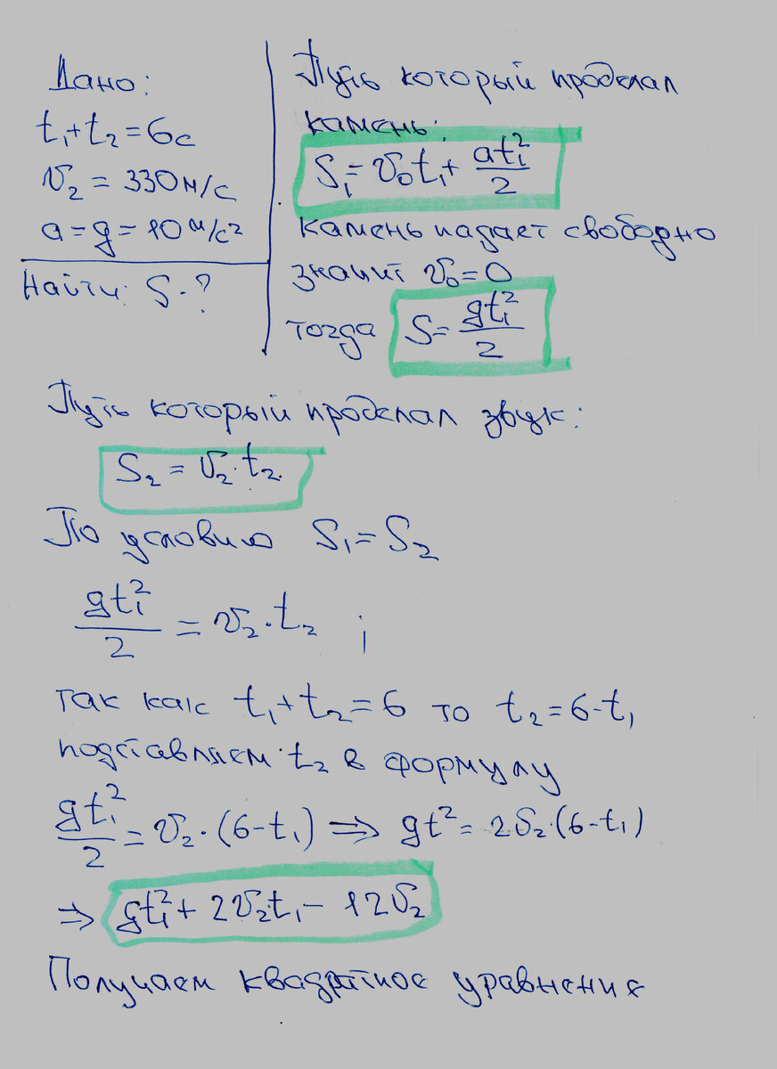 Задача: Камень свободно падает в шахту с водой. Через 6 с слышен всплеск воды. Определить глубину шахты, если скорость звука 330 м/с. Решение: Для того, что бы решить задачу, нам нужно понять, какие процессы мы наблюдаем. Первое, камень свободно падает в шахту, мы наблюдаем равноускоренное движение. Путь S при равноускоренном движении определяется по формуле S=Vo*t+a*t^2/2, (напоминаю в данном редакторе значок ^ означает степень, в нашем случае t в квадрате). Второе, после соприкосновения камня с водой, звук распространяется с постоянной скоростью, в данной ситуации мы имеем случай равномерного прямолинейного движения и путь рассчитываем по очень простой формуле S=V*t. Звук и камень у нас проделали одинаковый путь. А время через которое мы услышали всплеск это сумма времени (t1) за которое камень достиг воды и времени (t2) за которое звук достиг слушателя. То есть t1+t2=6c. Записываем решение: