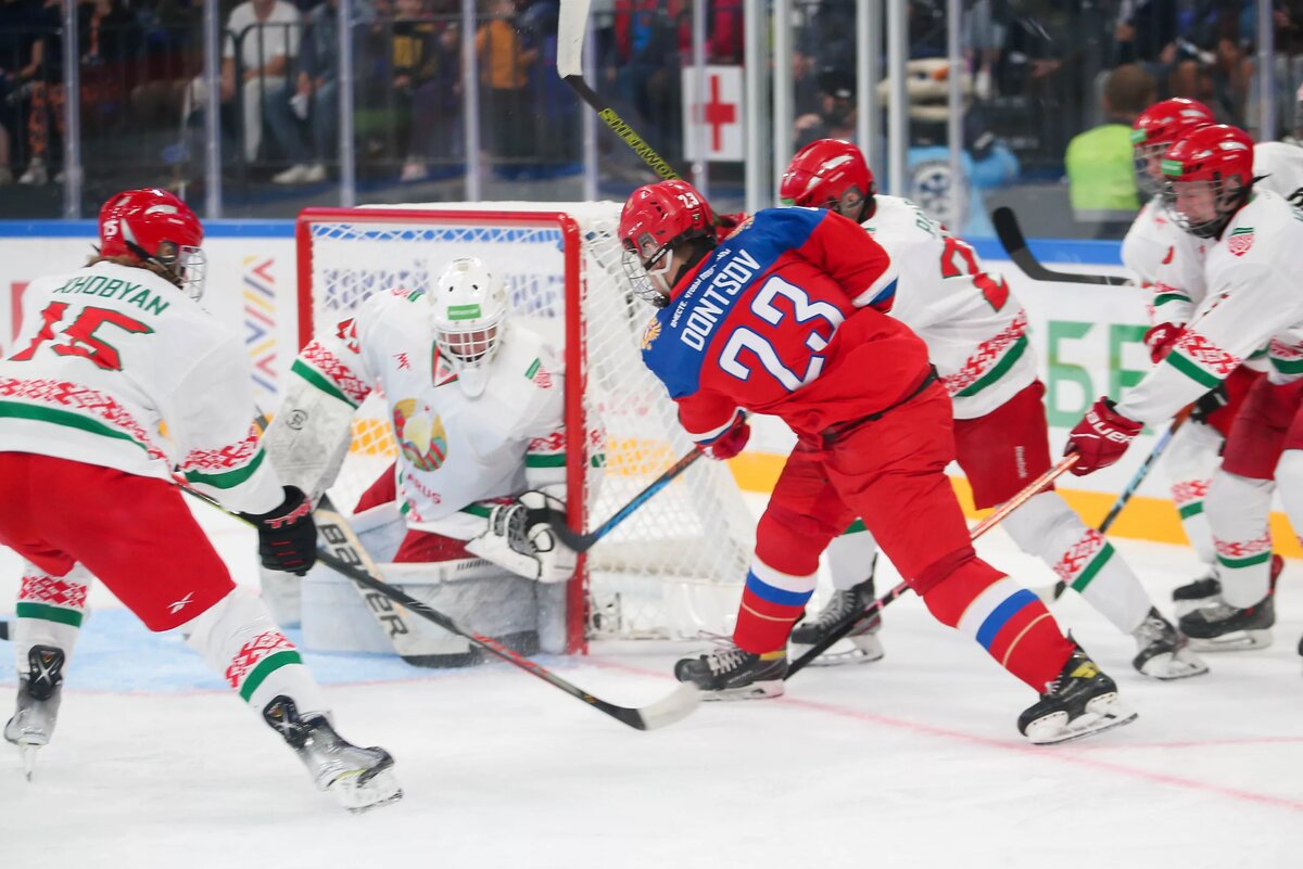 Счёт в первом периоде открыл хоккеист из российской команды, однако уже к его концу белорусы вырвали первенство, отправив в ворота соперников две шайбы.