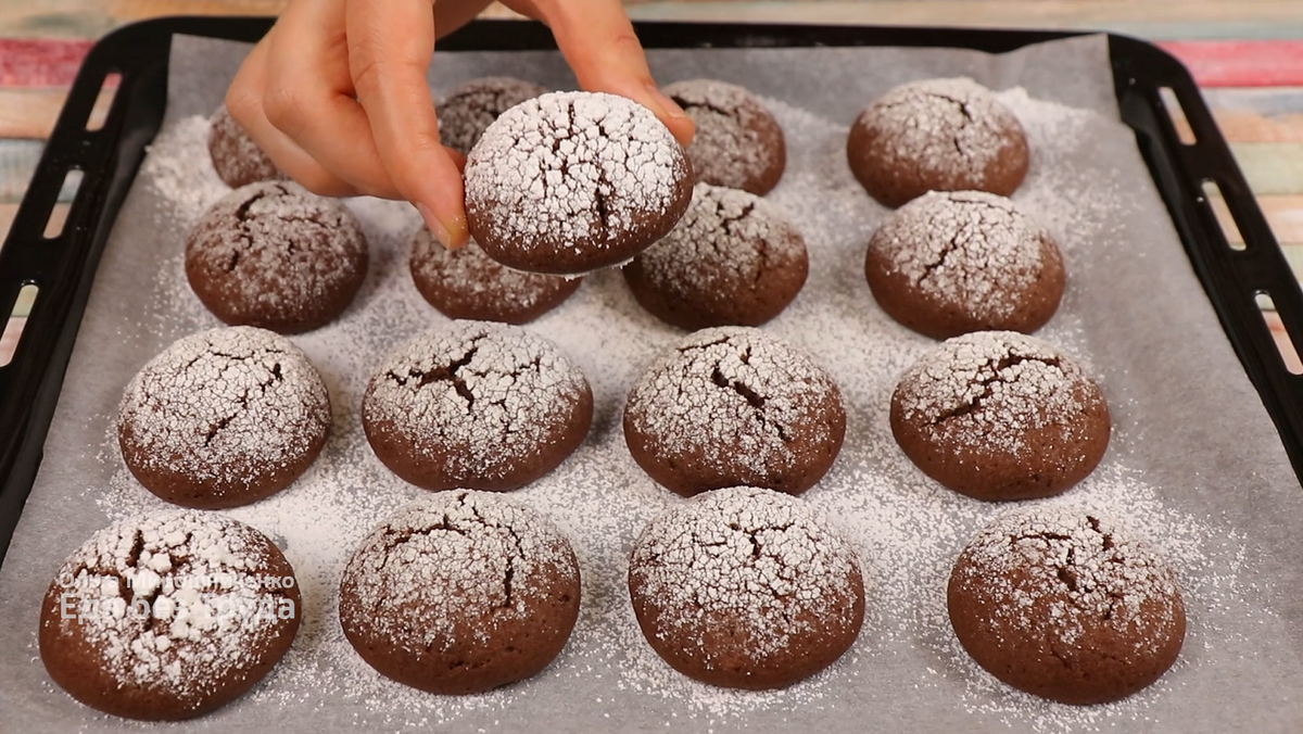 Очень вкусное и достойное печенье с маленьким бюджетом. Каждой хозяйке на заметку! В миску разбиваем 1 яйцо (прям из холодильника), добавляем 100 г сахара, 10 г ванильного сахара и щепотку соли. Перемешиваем венчиком до легкой пены ~ 2минуты. Сахар за это время растворится не успеет. Далее вливаем 70 мл растительного масла без запаха и 50 мл воды комнатной температуры. Перемешиваем. Через сито просеиваем 20 г какао. Далее порционно просеиваем муку и всыпаем 10 г разрыхлителя. Поначалу я просеяла 250 г муки, затем добавила еще 50 г муки. Замешиваем тесто ложкой, затем руками. Главное, не забивайте тесто мукой. Готовое тесто липнет к рукам, но оно держит форму, не расплывается. Далее руки смазываем капелькой масла, а противень застилаем антипригарным пергаментом. Берем 1 ч.л теста и катаем колобок. Затем слегка его расплющиваем. Заготовки выкладываем на небольшом расстоянии друг от друга. Сверху заготовки обильно посыпаем сахарной пудрой. Выпекаем печенье в заранее разогретой духовке