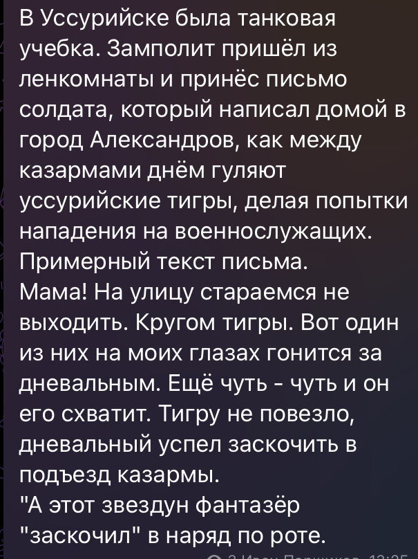 Вспомнилось, как в 90-е годы парковый (начальник гаража) прапорщик Николай Л... смеясь, отдал недописанное письмо моего бойца Николая М..., которое он забыл, будучи в наряде дневальным по парку.