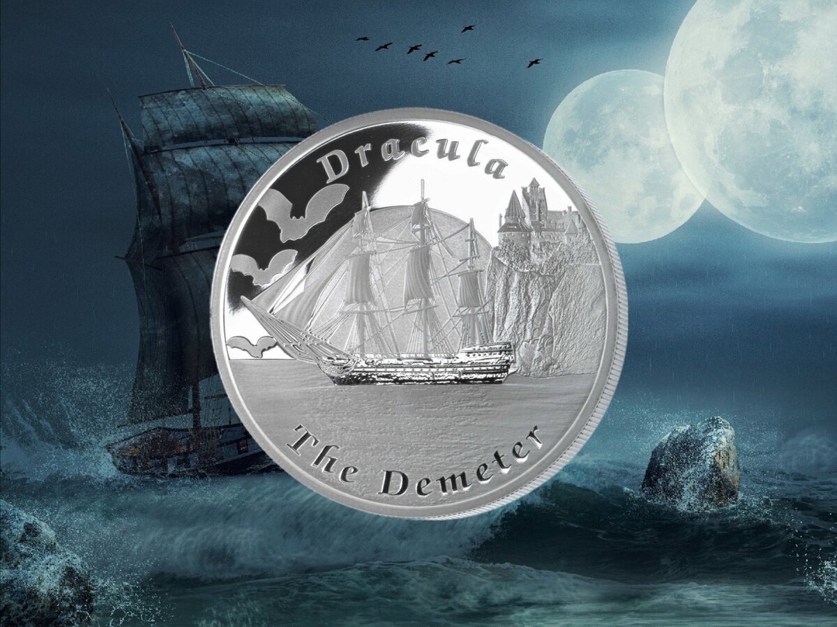 На монете Тувалу изображен парусник «Деметр», который знаменит своим связанным с Дракулой приключением.