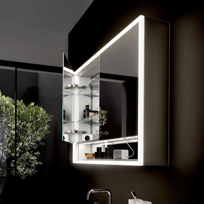 - Шкафы с подсветкой — современное решение, которое добавляет дополнительное освещение в ванной комнате. Это могут быть встроенные светодиоды или подсветка вокруг рамы зеркала. Такие шкафы создают приятную атмосферу и улучшают видимость в зеркале.