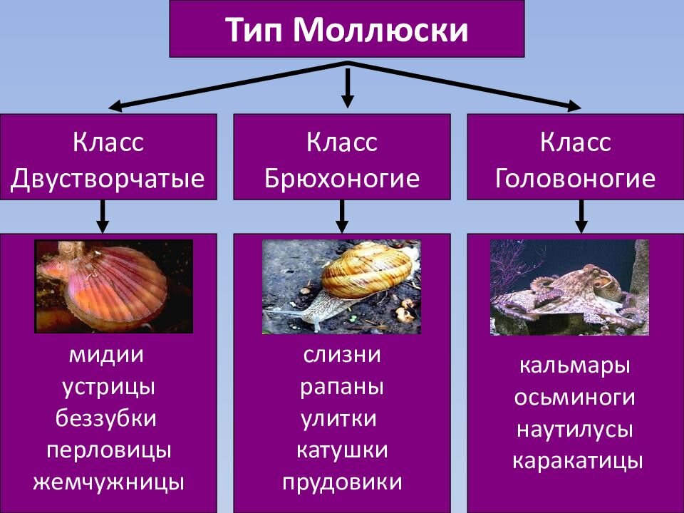- Головоногие. Отличительной чертой организмов данного типа является голова и большое количество щупалец, расположенных вокруг неё (осьминоги, кальмары).