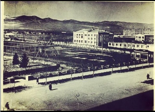 Неожиданная хронология строительства. Не знал, что здание Госбанка, минфина (Головко 2) построено раньше турбазы Нальчик, которой на фото ещё в помине нет и Дома Советов, который строится вдали. Правда и у него нет крыла, которое по Головко. Далее дом по Головко 4. Сейчас там Ростелеком. А что было раньше, кто помнит?) Неизменен лишь заборчик парка,вдоль Лермонтова, Арку-вход в парк заменил памятник Б. Калмыкову. Кажется это был тогда центральный вход..