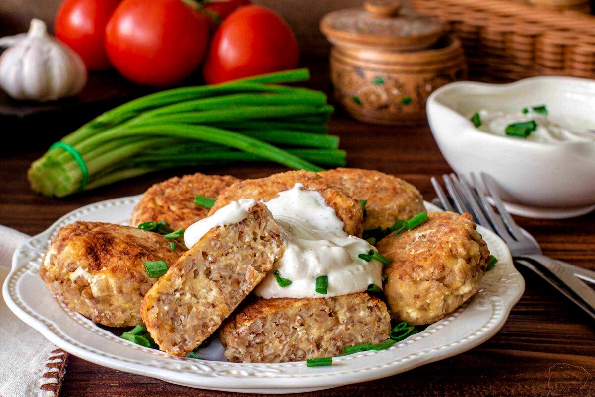 Смешать в миске фарш с гречкой, картофельным пюре и обжаренным луком. Приправить солью и перцем по вкусу. Из полученной массы сформировать небольшие круглые биточки. Обмакнуть во взбитое